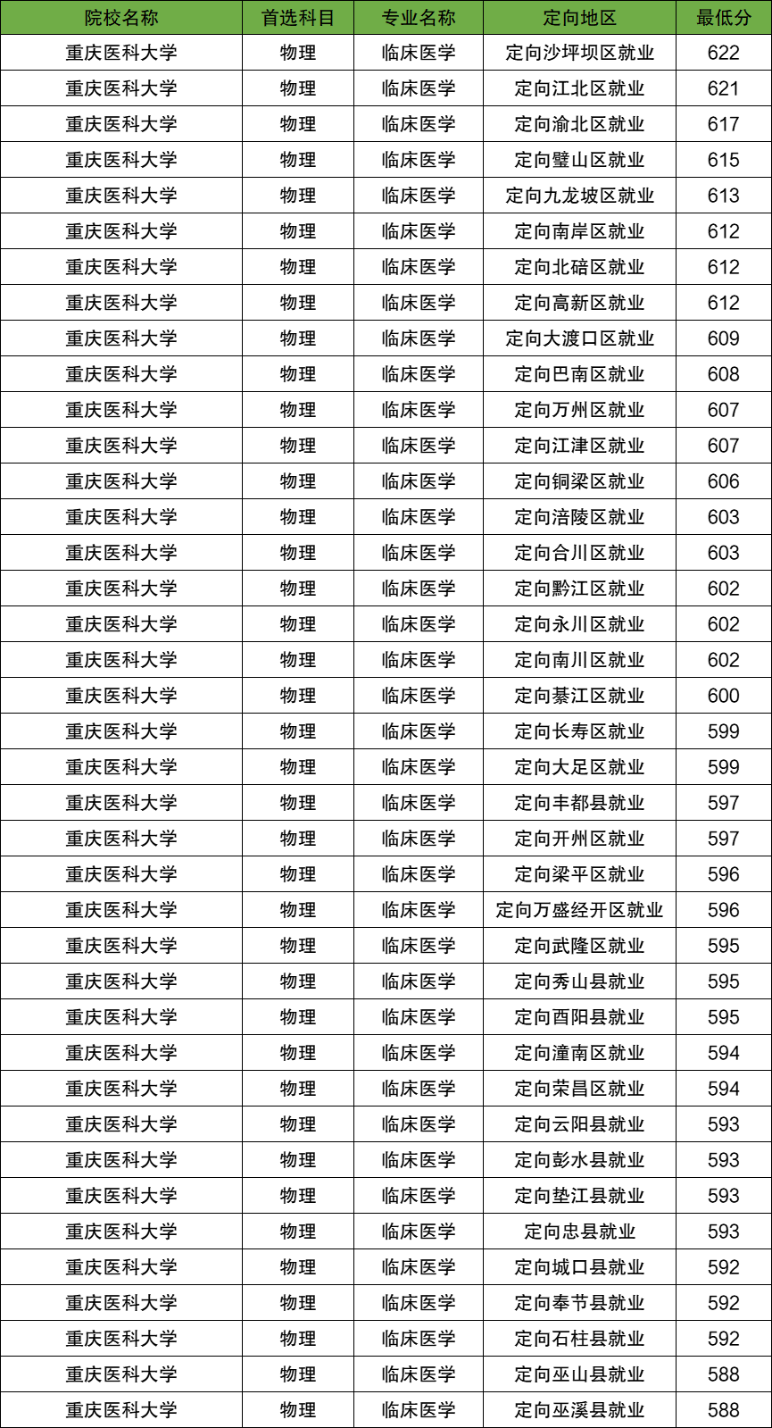 今年的最高分为622分,定向沙坪坝区就业;最低分为588分,定向巫溪县就业。