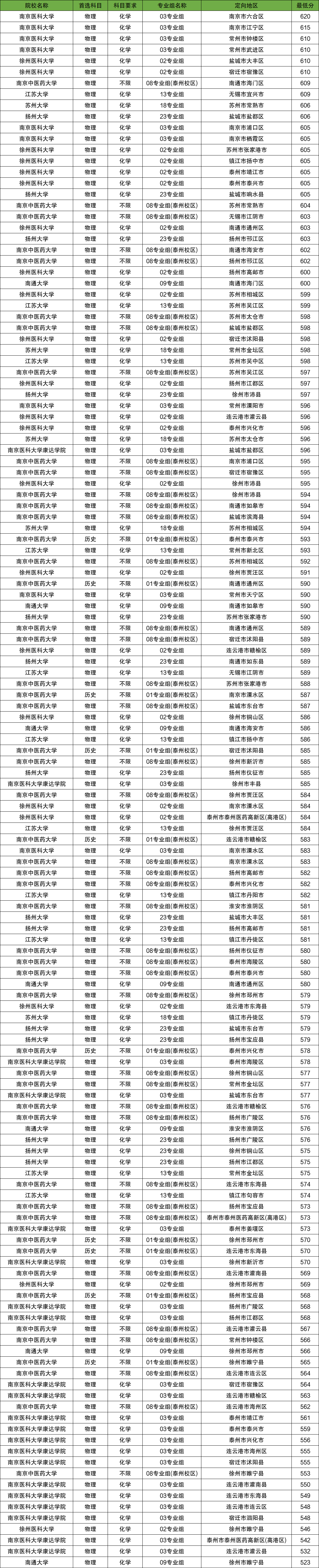在公费医学生的录取中,物理类分数最高的是南京医科大学03专业组(南京市六合区),2025年的投档分是620分;分数最低的是南通大学09专业组(徐州市睢宁县),2025年的投档分是523分。