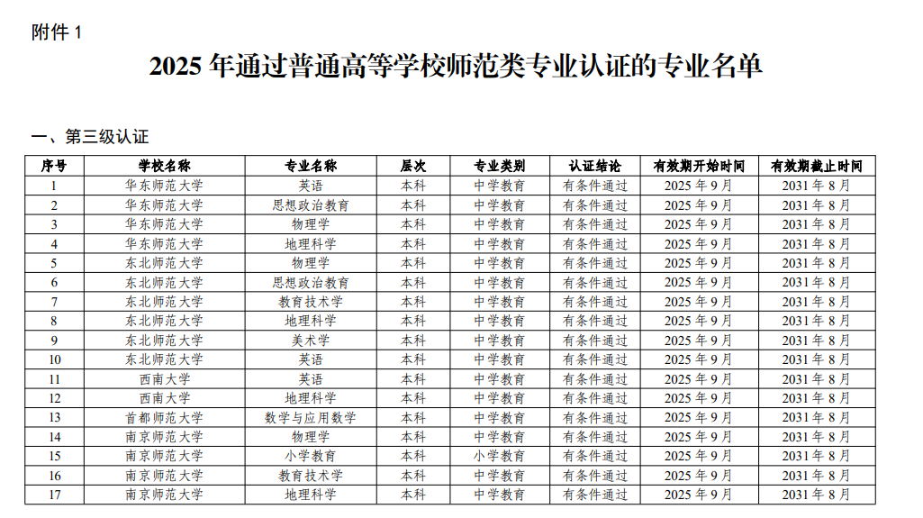 2025年9与23日,教育部公示了获得师范类专业认证的学校名单。公示显示,2025年一共17个专业通过第三级专业认证,576个专业通过第二级专业认证。