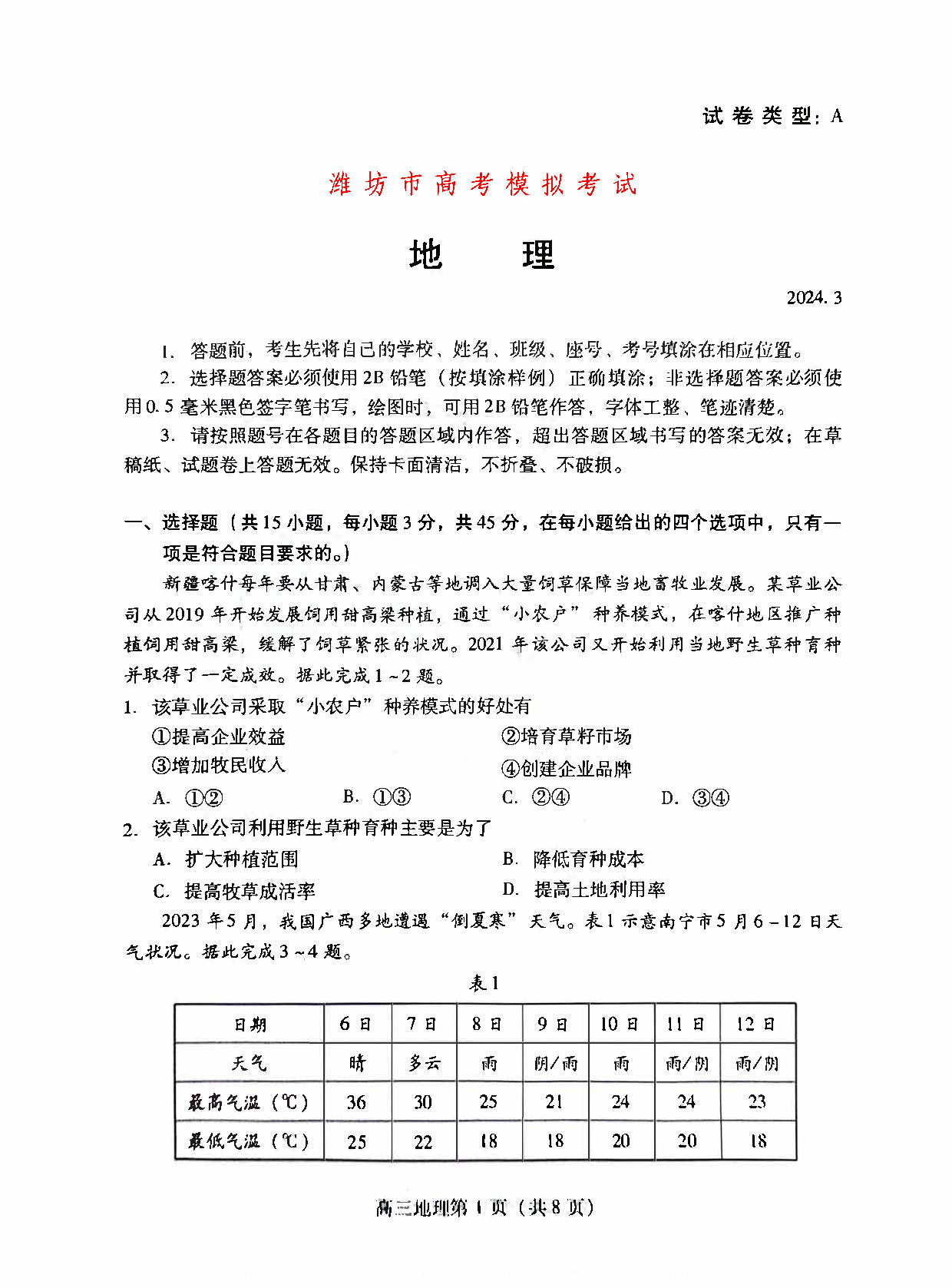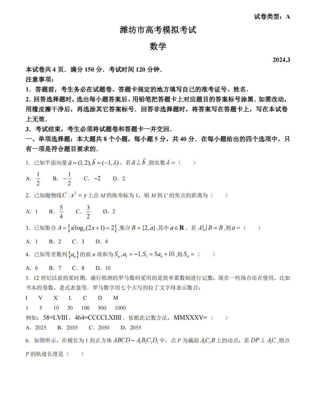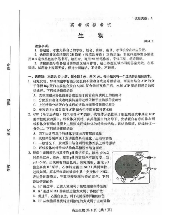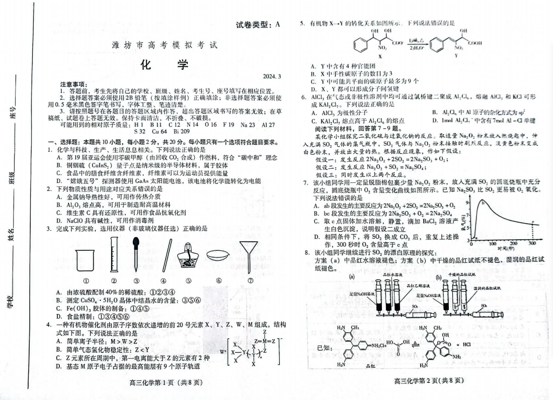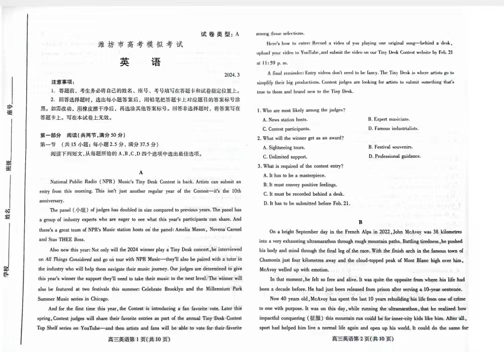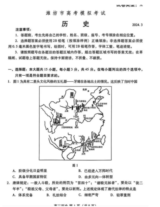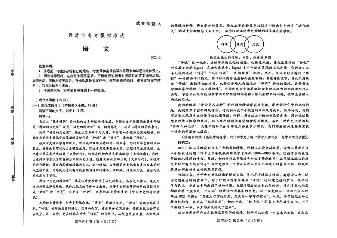2024潍坊一模各科试卷及答案解析
