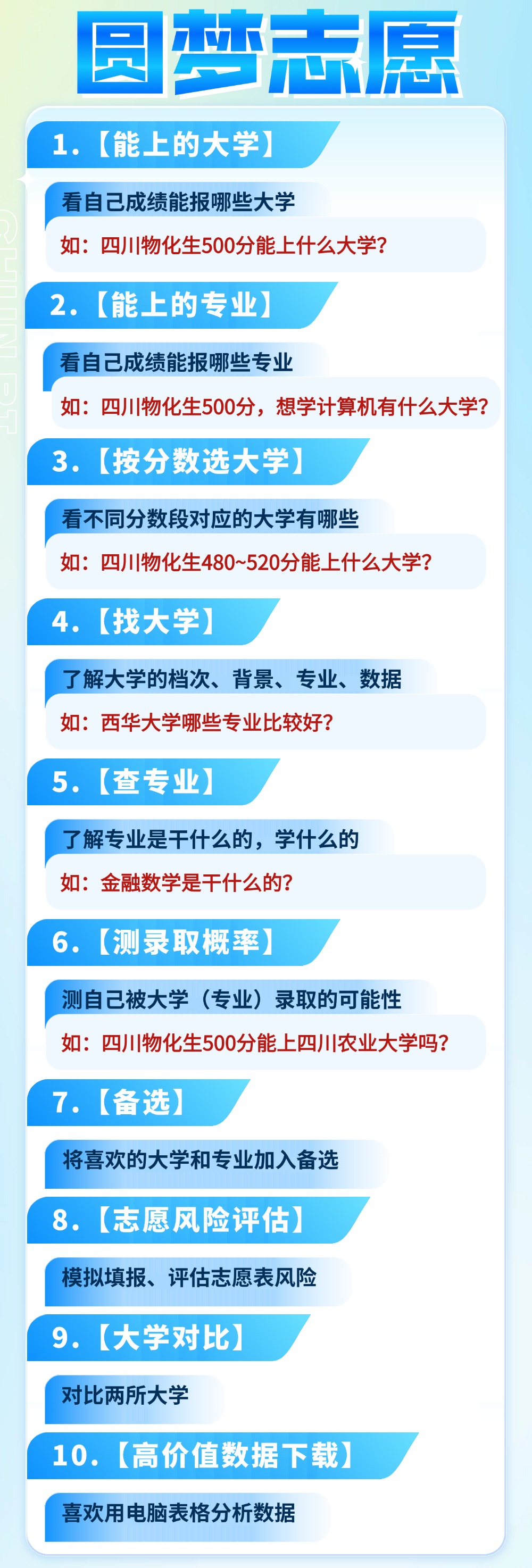 圆梦志愿的价值远不止“一键匹配院校”,更覆盖志愿填报全流程需求。针对考生和家长的深层困惑,其内置多项实用功能: