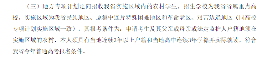 地方专项:大部分省份要求考生为农村地区户籍,有些省份要求考生本人须具有当地连续3年以上户籍和当地高中连续3年学籍并实际就读。符合考生所在省份本年度统一高考报名条件并已参加当年高考报名。