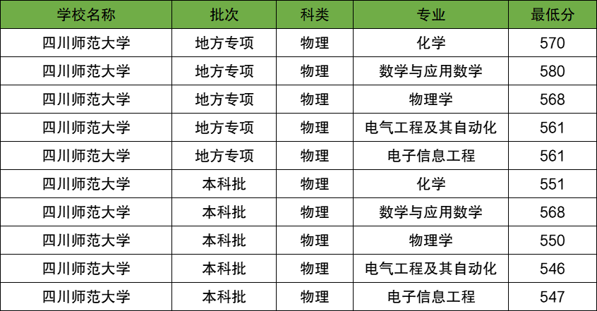 如:四川师范大学2025年本科化学专业在地方专项计划中最低录取分数为570分,而在本科批的最低录取分数为551分,比地方专项中低了19分。而物理学专业在地方专项计划中最低录取分数为568分,在本科批的最低录取分数为550分,比地方专项中低了18分。