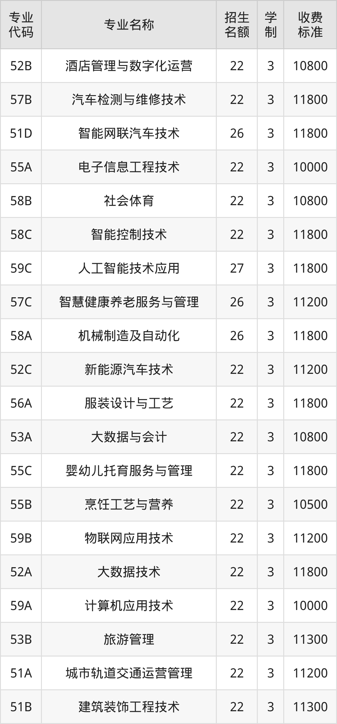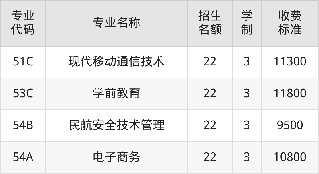 | 专业 代码 | 专业名称 | 招生 名额 | 学 制 | 收费 标准 |