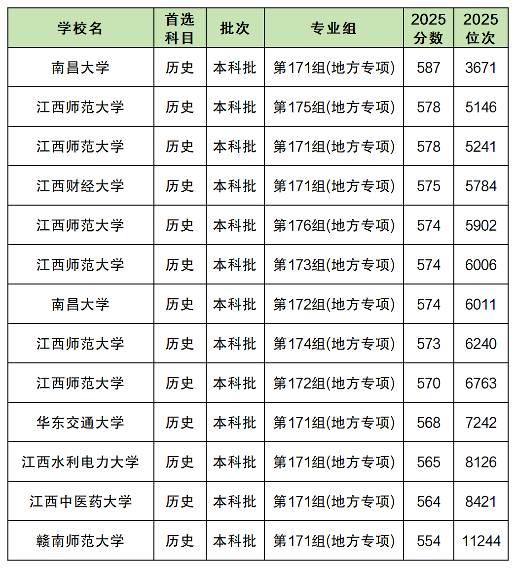 以下是2025年各大学地方专项计划在江西历史类的录取分数线一览表: