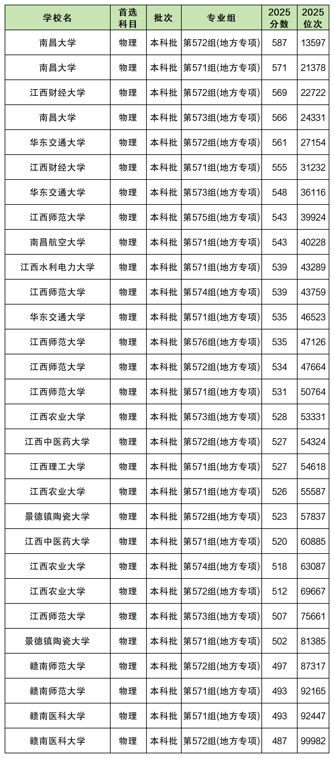 2025年各大学地方专项计划在江西物理类的招生专业组要多于历史类,物理类各大学地方专项计划各专业组的录取分数线在487分-587分之间;录取分数最高的是南昌大学第572组(地方专项),最低分为587分;录取分数最低的是赣南医科大学第572组(地方专项),2025最低分为487分。