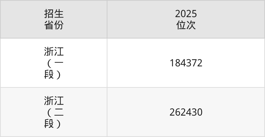 浙江金华科贸职业技术学院2025年的位次差异较大,最高位次是184372位(浙江)、最低位次是262430位(浙江)。具体位次请看下图: