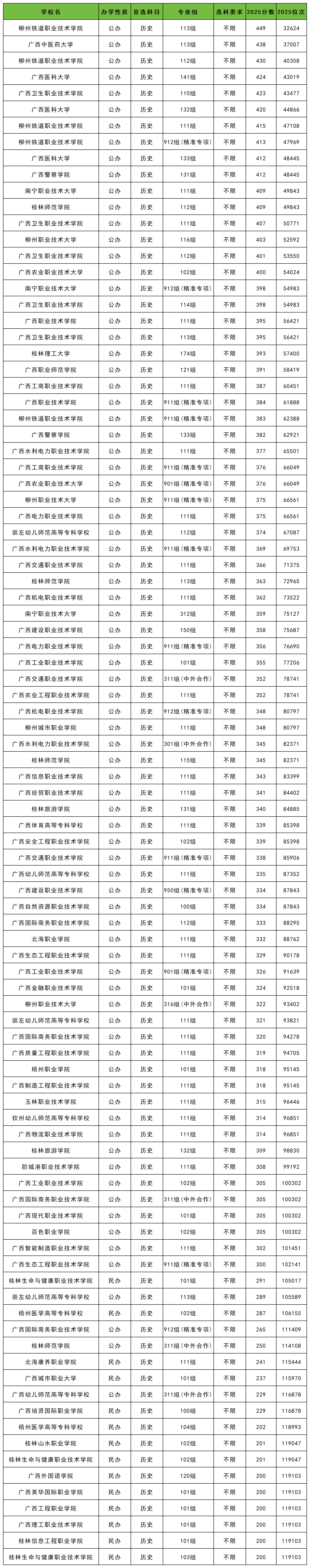 2025年广西各大学专科录取分数线位于200分到449分之间,对应位次从119103名到32624名。分数线最高的是柳州铁道职业技术学院113组,分数线最低的有桂林生命与健康职业技术学院103组、广西理工职业技术学院101组、广西工程职业学院101组等。
