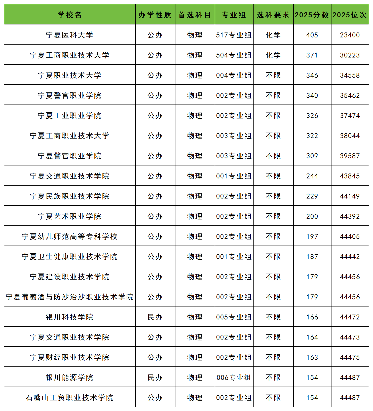 2025年宁夏各大学专科录取分数线位于154分到405分之间,对应位次从44487名到23400名。分数线最高的是宁夏医科大学517专业组,分数线最低的是石嘴山工贸职业技术学院002专业组、银川能源学院006专业组,