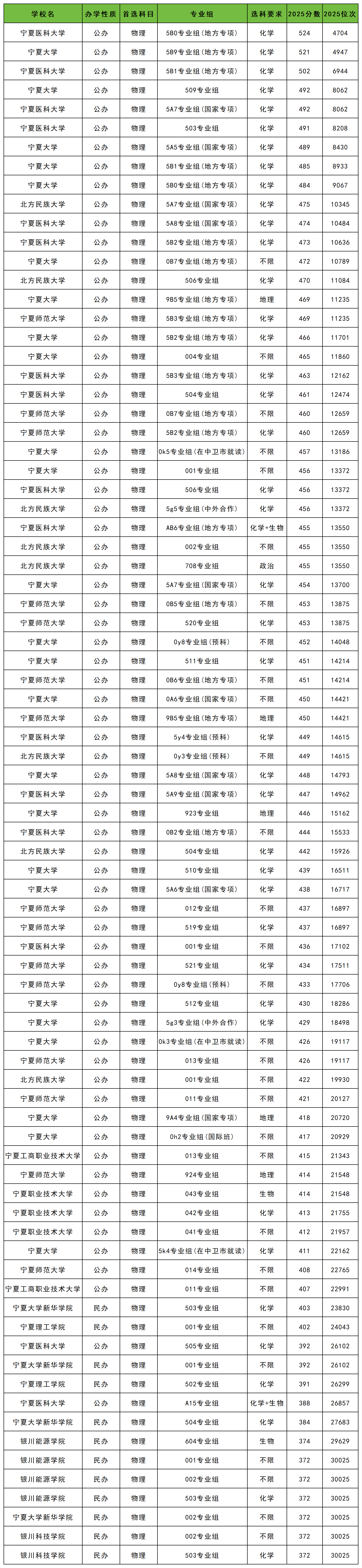 2025年宁夏各大学本科录取分数线位于372分到524分之间,对应位次从30025名到4704名。分数线最高的是宁夏医科大学5B0专业组(地方专项),分数线最低的有银川科技学院503专业组、银川能源学院503专业组、宁夏大学新华学院002专业组等。