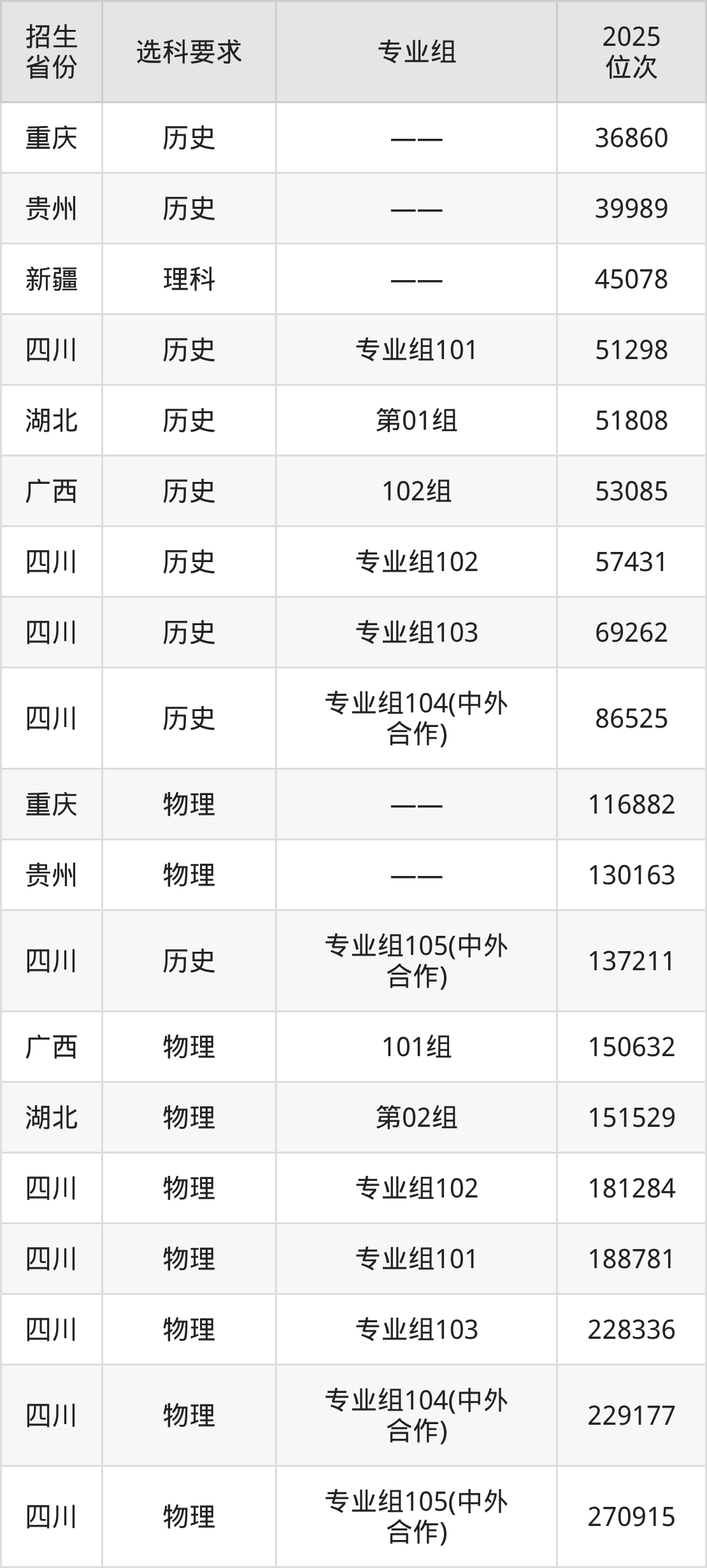 成都职业技术学院2025年在全国各省的位次差异较大,最高位次是36860位(重庆历史类)、最低位次是270915位(四川物理类)。各省具体位次请看下图: