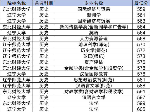 东北财经大学(法学599分)、辽宁大学(汉语言文学597分)、辽宁师范大学(汉语言文学(师范)588分)等。