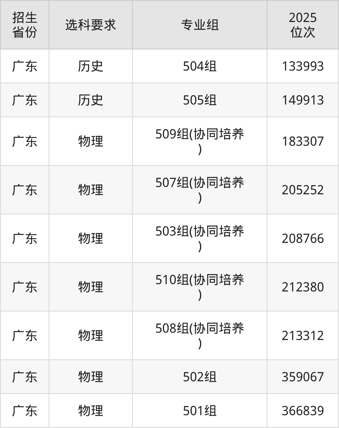 广东松山职业技术学院2025年的位次差异较大,最高位次是133993位(广东历史类)、最低位次是366839位(广东物理类)。具体位次请看下图: