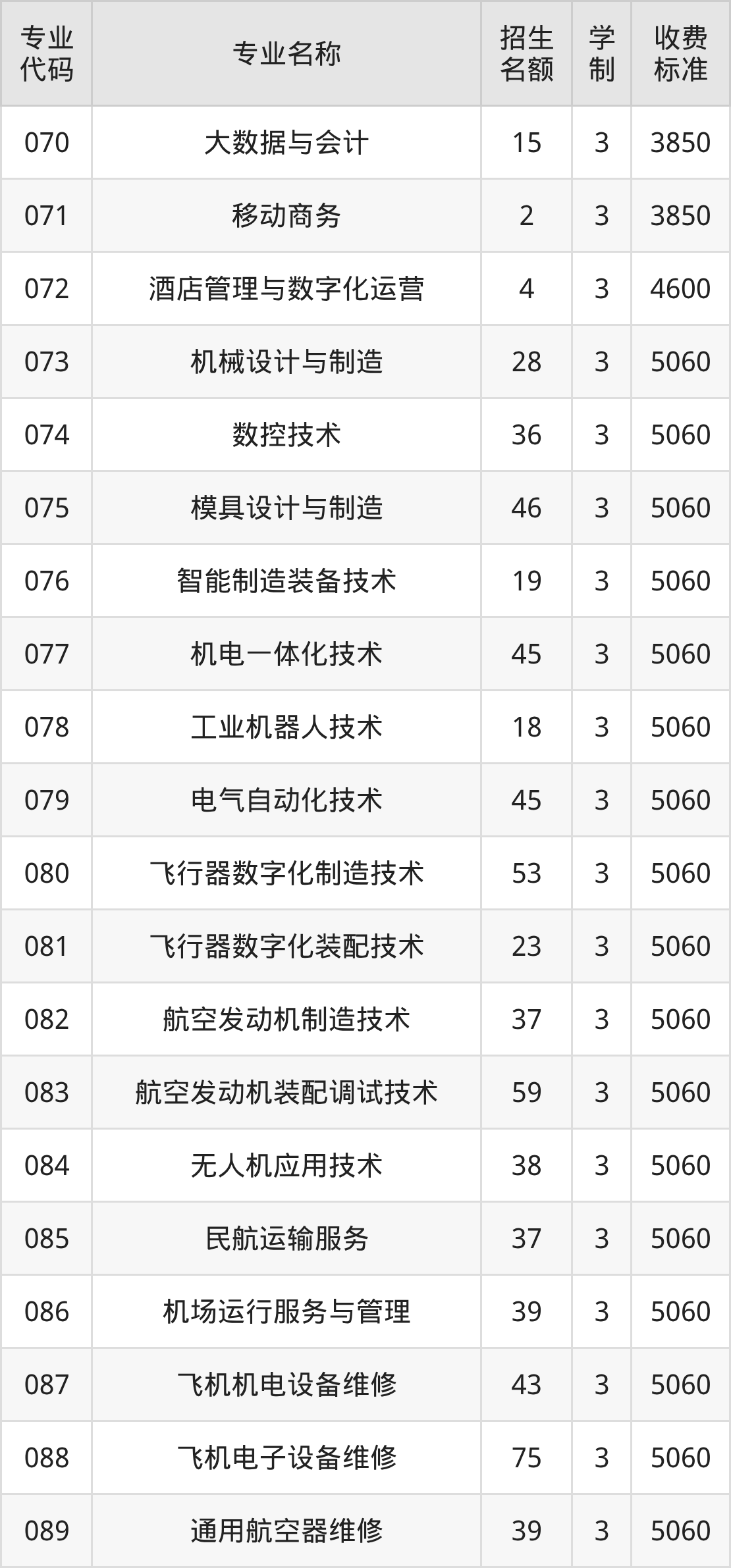 | 专业 代码 | 专业名称 | 招生 名额 | 学 制 | 收费 标准 |