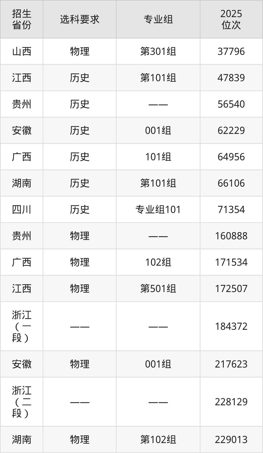 温州科技职业学院2025年在全国各省的位次差异较大,最高位次是37796位(山西物理类)、最低位次是229013位(湖南物理类)。各省具体位次请看下图: