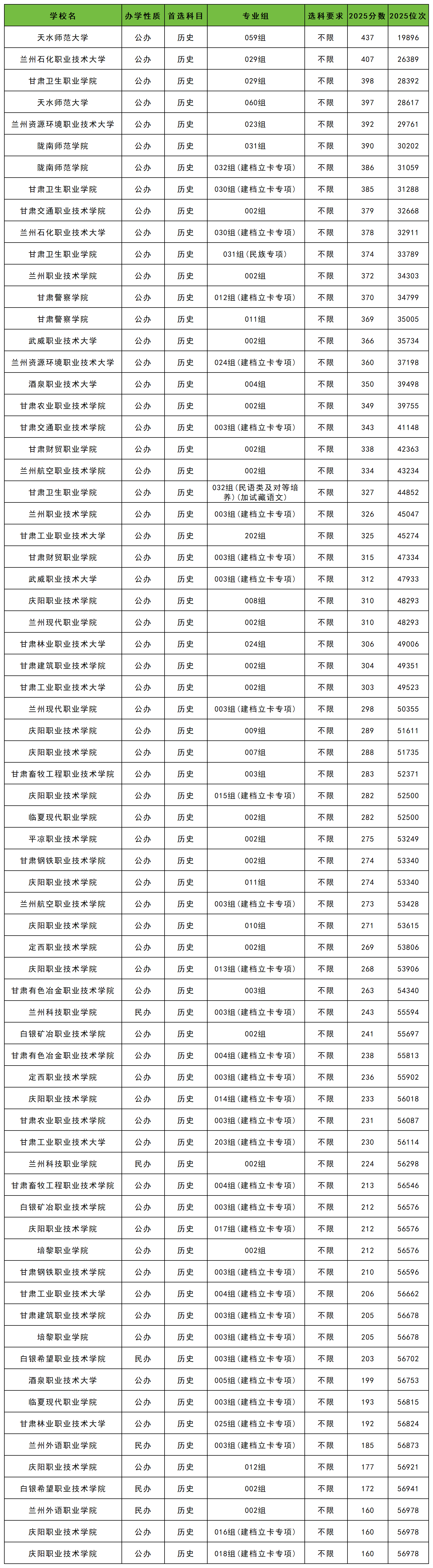 2025年甘肃各大学专科录取分数线位于160分到437分之间,对应位次从56978名到19896名。分数线最高的是天水师范大学059组,分数线最低的有庆阳职业技术学院018组(建档立卡专项)和016组(建档立卡专项)、兰州外语职业学院002组。