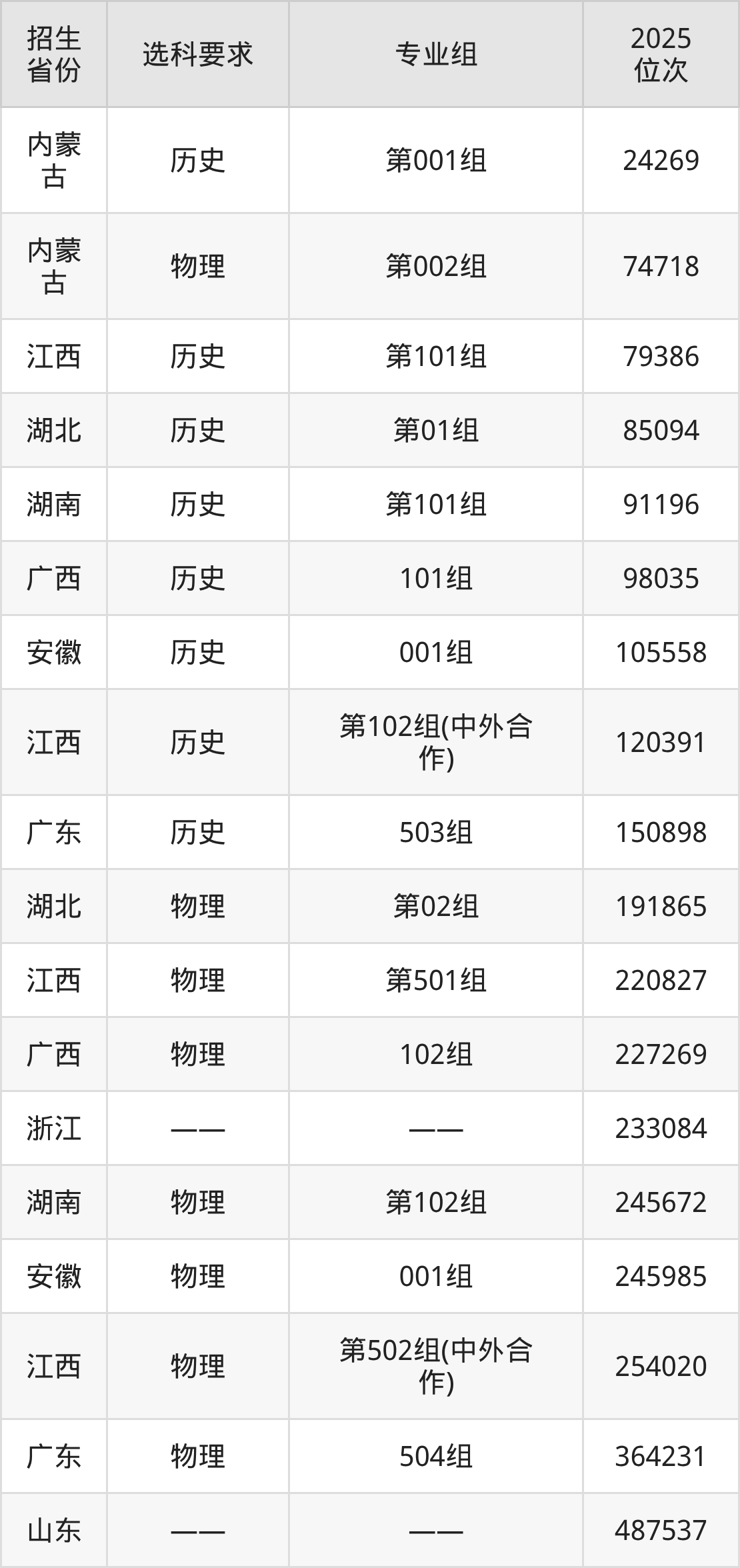 江西旅游商贸职业学院2025年在全国各省的位次差异较大,最高位次是24269位(内蒙古历史类)、最低位次是487537位(山东)。各省具体位次请看下图: