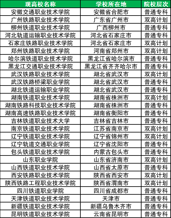 注:铁道类高职院校名单可能会随着院校升格、更名等因素变化而变化,考生最终需以当年发布了招生简章或招生章程的大学名单为准。