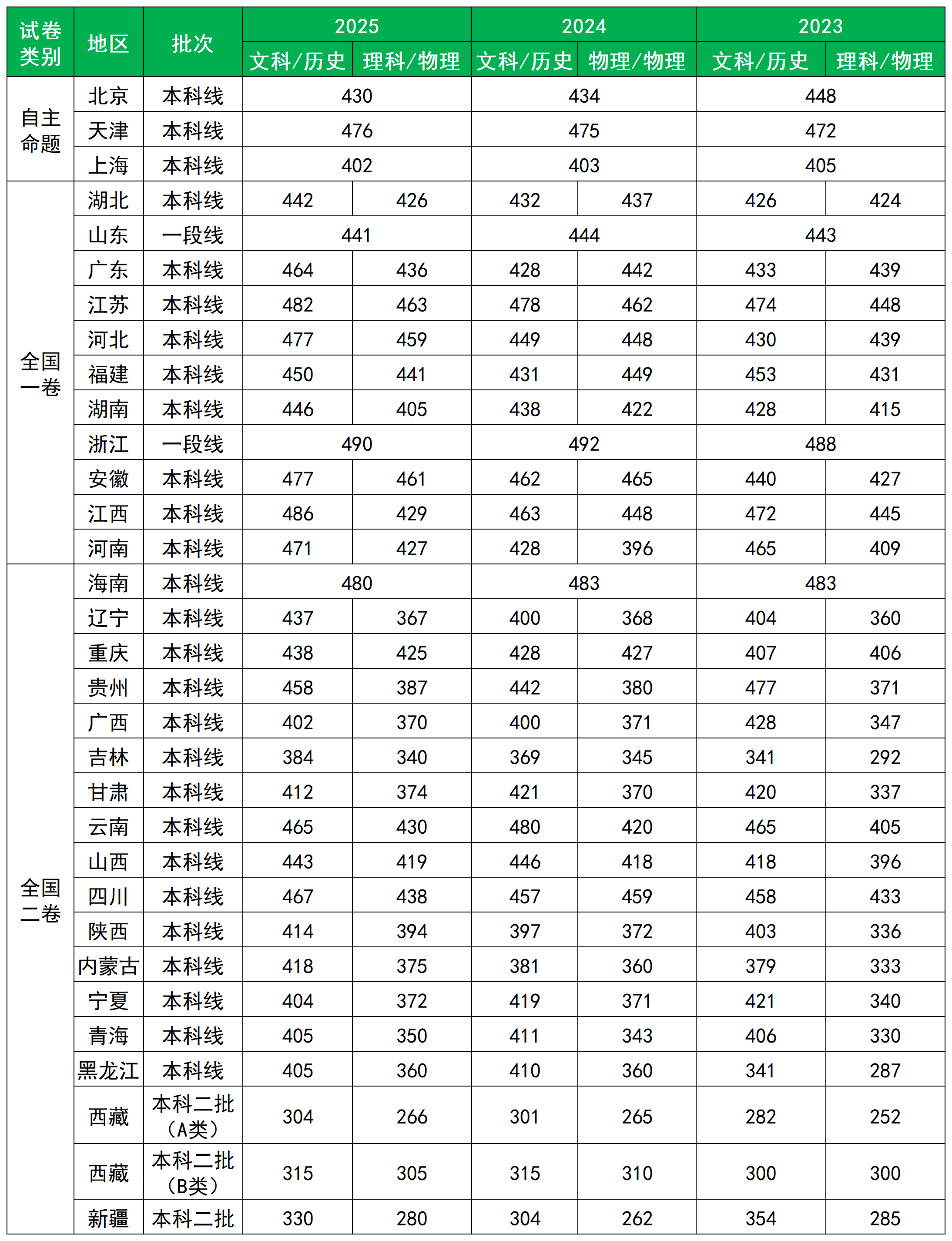 三、2023至2025年全国高考本科线