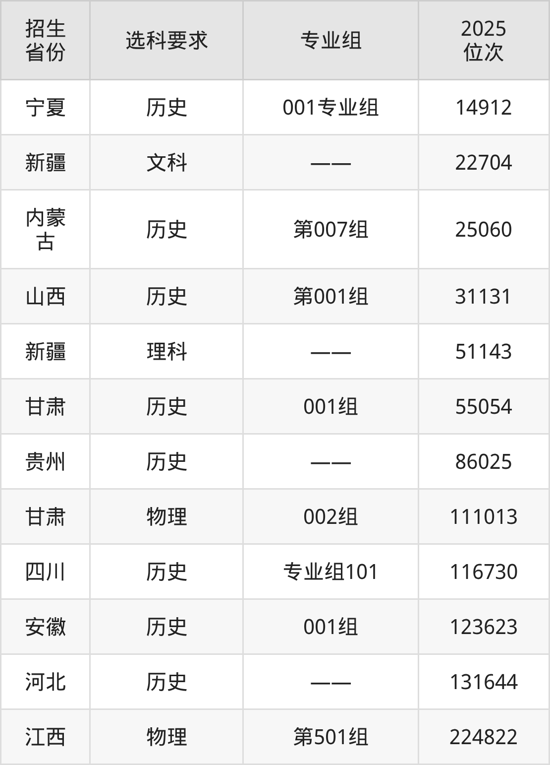 陕西艺术职业学院2025年在全国各省的位次差异较大,最高位次是14912位(宁夏历史类)、最低位次是224822位(江西物理类)。各省具体位次请看下图: