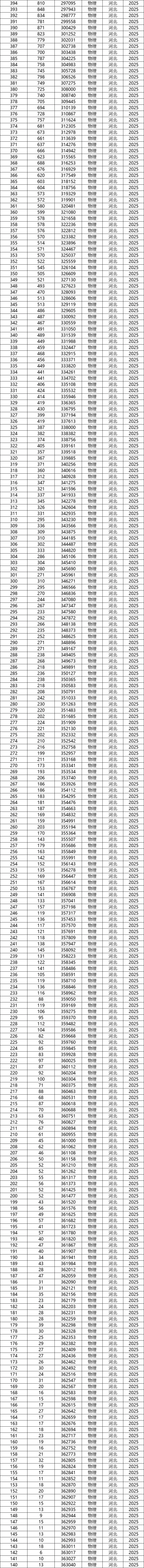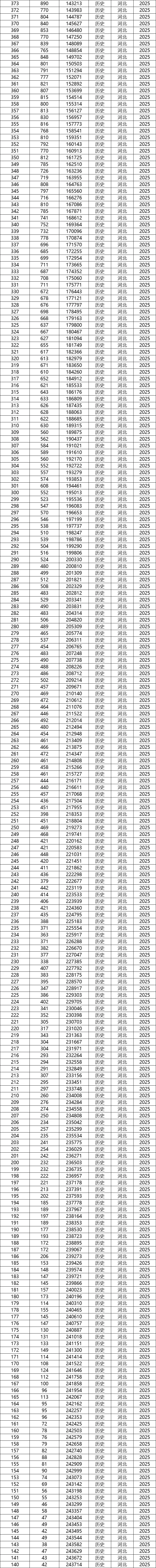 2025年河北物理类一分一段表中,最高分数线为693分及以上,共有32名同分考生,680分考生的排名为267名;600分共有786名同分考生,600分考生的排名为27073。