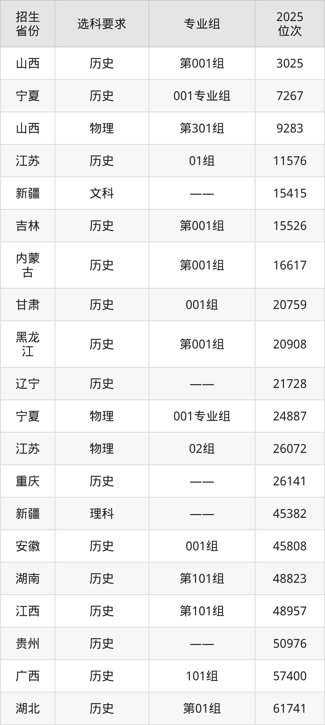 石家庄铁路职业技术学院2025年在全国各省的位次差异较大,最高位次是3025位(山西历史类)、最低位次是359716位(山东)。各省具体位次请看下图: