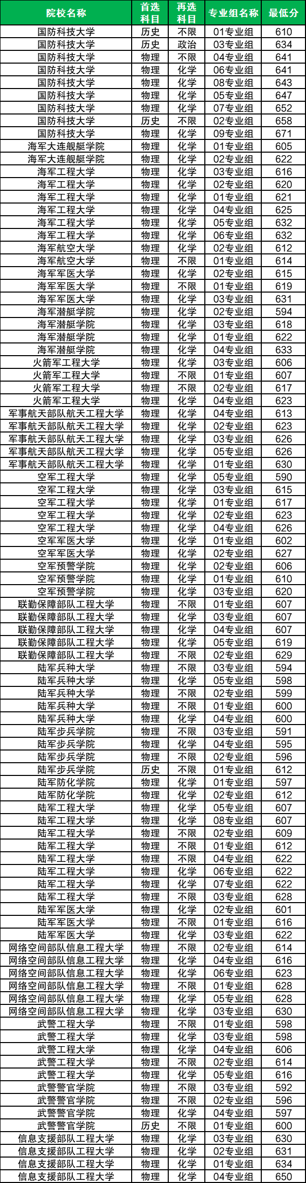 因为面向历史组招生的军校只有3所(5个专业组),数据较少,所以各选科组合的分数差异不大。军校“历史+政治”组合录取分数线为634分,对应国防科技大学03组;军校“历史+不限”组合录取分数线为600分-658分,对应最低分院校是武警警官学院(01组)、最高分院校是国防科技大学(02组)。