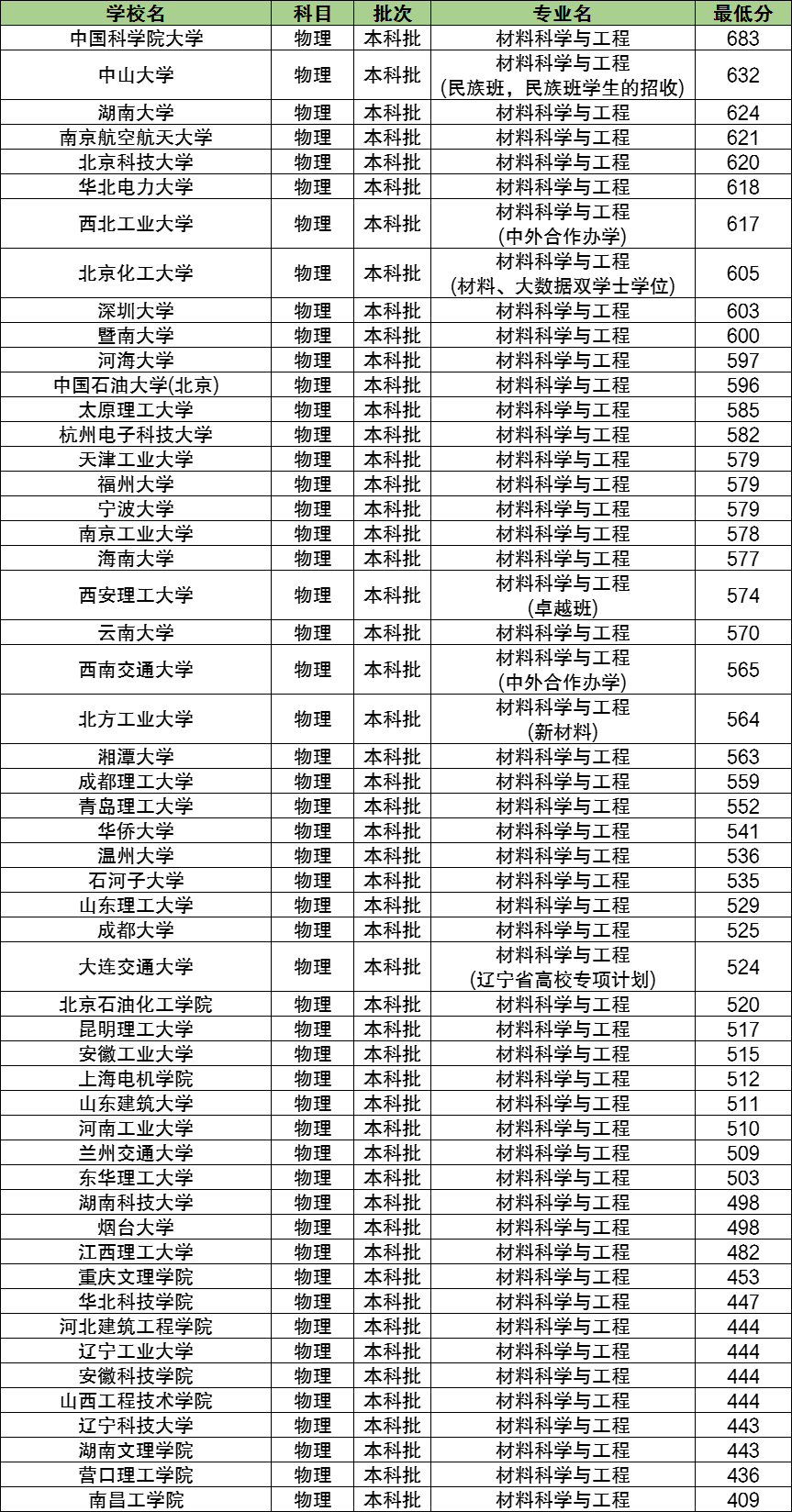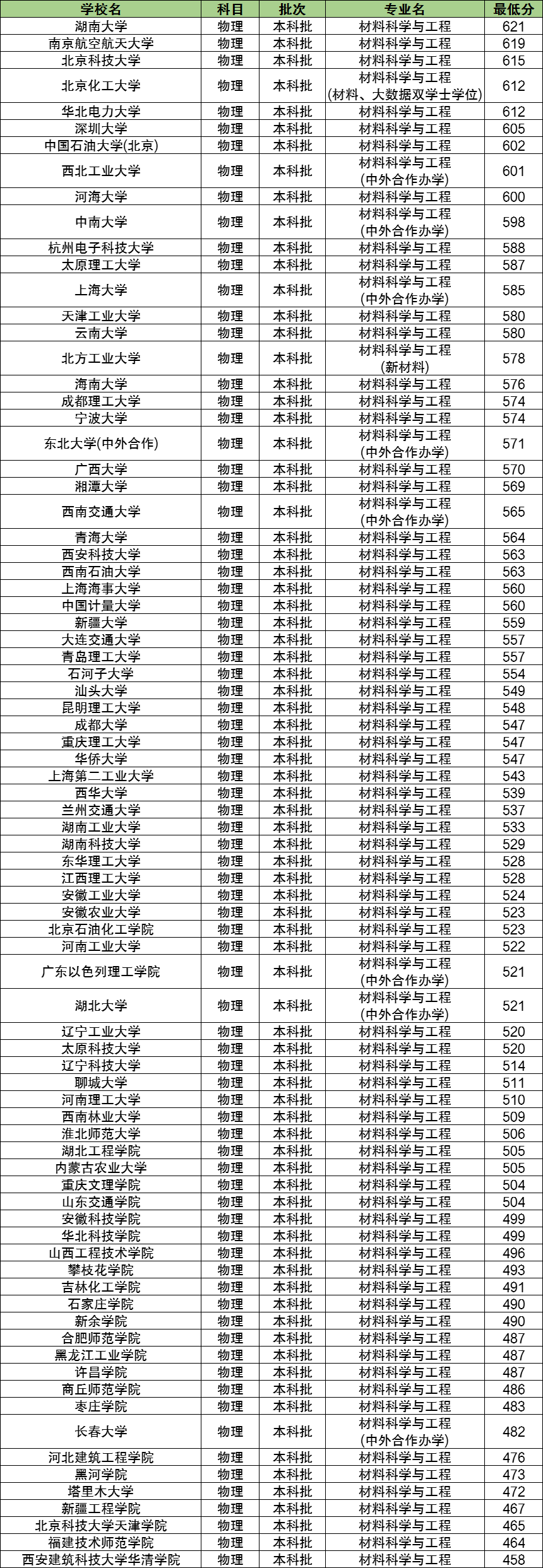 下表为2023年全国大学材料科学与工程专业在河北物理科目的最低分数排名。