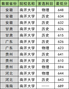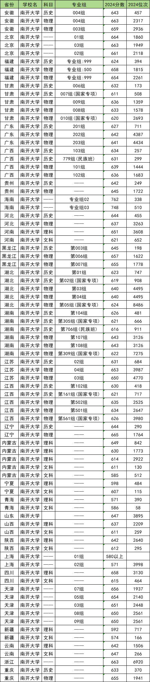 南开大学2025年录取分数线已公布,本科提前批分数各省详情如下:
