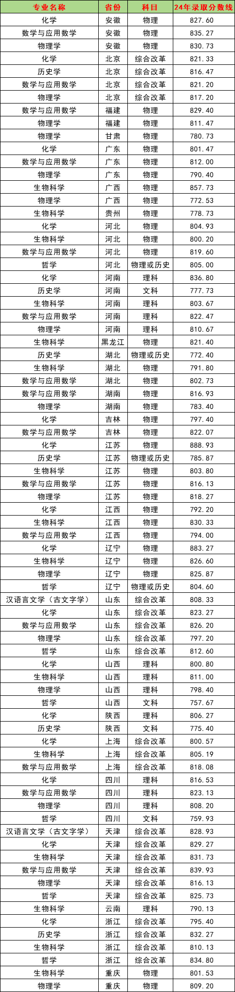 南开大学强基计划录取分数属于综合成绩,其计算公式为:综合成绩(保留2位小数)=高考成绩/高考成绩满分*850+学校考核成绩(满分150)。下面是其2024年在各省强基招生最终的录取成绩: