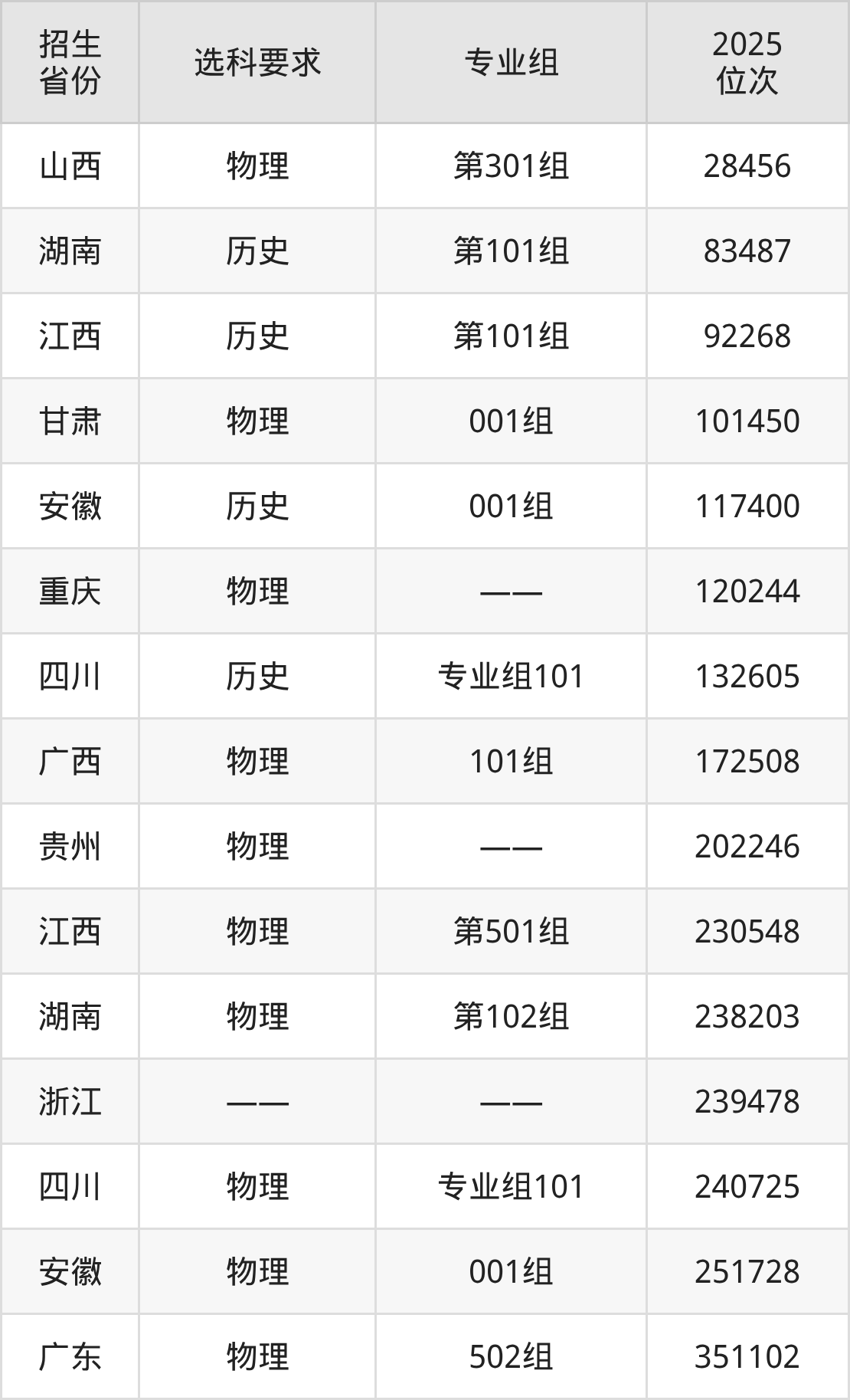 江西工业职业技术学院2025年在全国各省的位次差异较大,最高位次是28456位(山西物理类)、最低位次是351102位(广东物理类)。各省具体位次请看下图:
