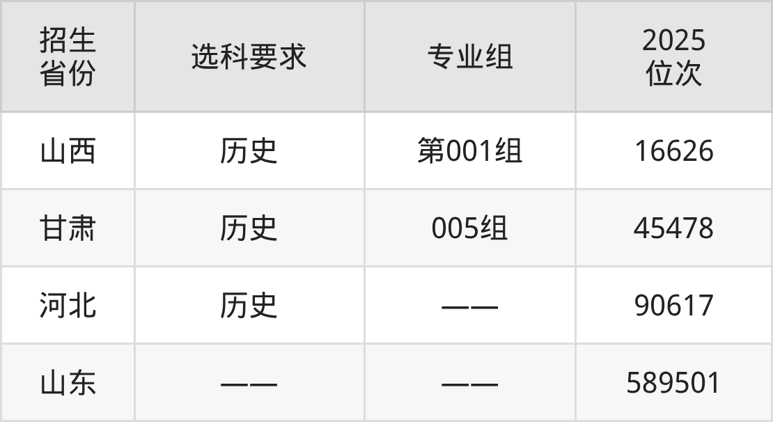 山东特殊教育职业学院2025年在全国各省的位次差异较大,最高位次是16626位(山西历史类)、最低位次是589501位(山东)。各省具体位次请看下图: