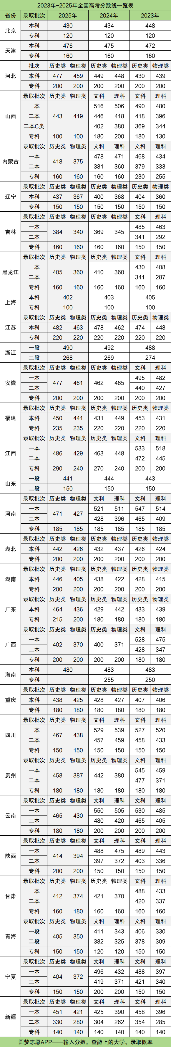 为给大家提供具体的数据参考,下面整理了2023年、2024年和2025年全国高考录取分数线一览表,考生可查看本省高考分数线趋势。
