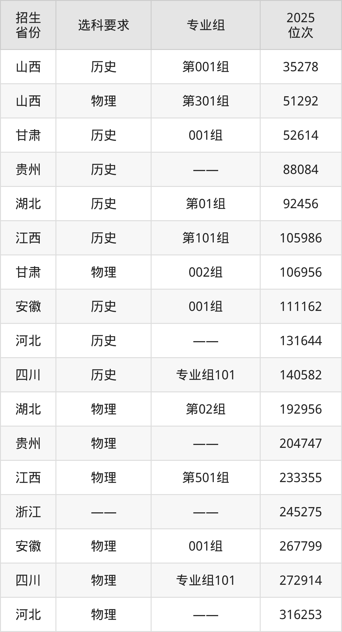 天门职业学院2025年在全国各省的位次差异较大,最高位次是35278位(山西历史类)、最低位次是316253位(河北物理类)。各省具体位次请看下图: