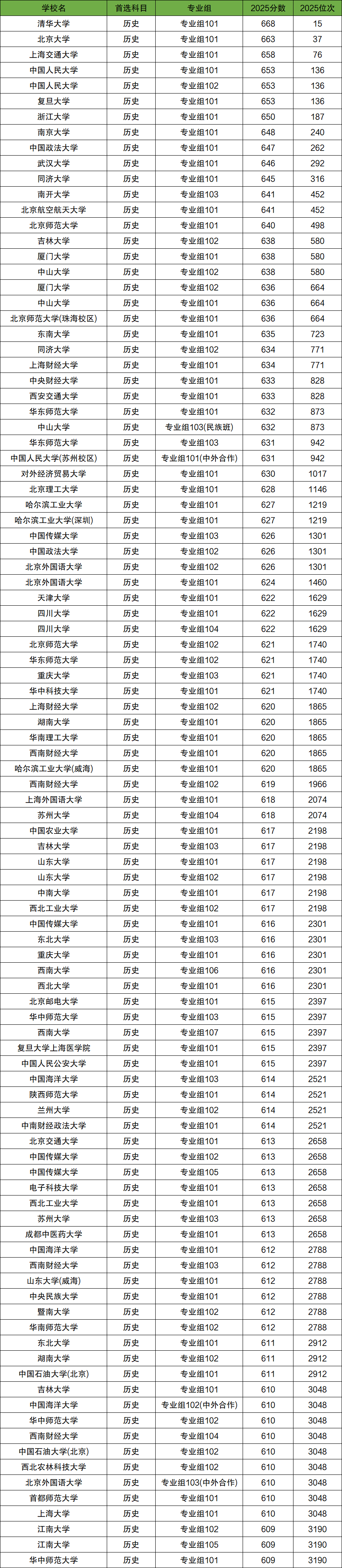 历史类双一流大学分数线前100名榜单一览: