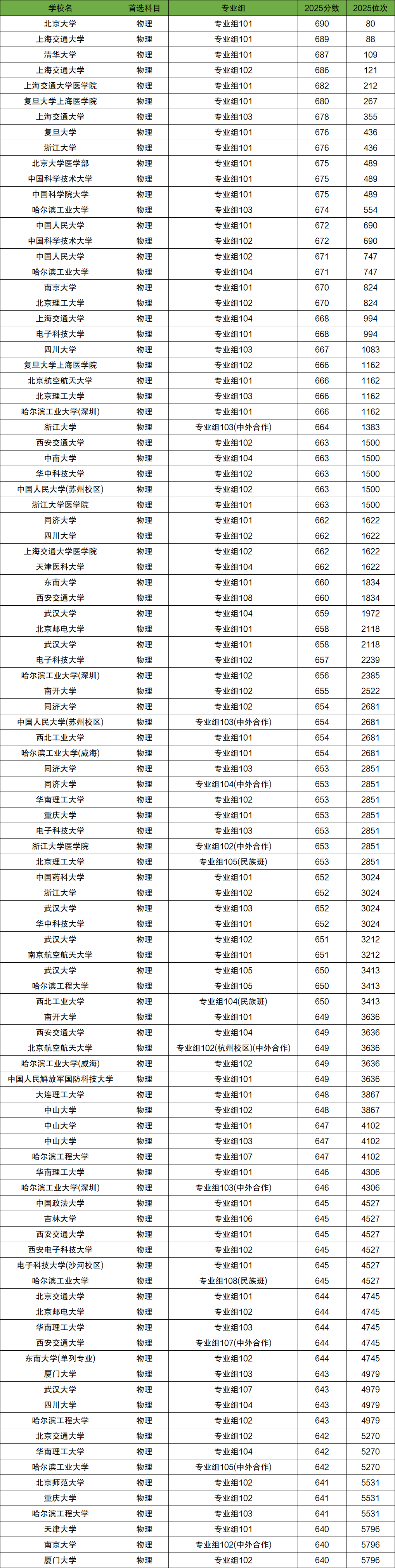 2025年全国一共有673个双一流大学物理类招生专业组,其中位次排名最高的5个专业组分别是:北京大学专业组101(690分)、上海交通大学专业组101(689分)、清华大学专业组101(687分)、上海交通大学专业组102(686分)、上海交通大学医学院专业组101(682分)。这5个专业组录取分数线最高,是物理类考生最值得上、最好的双一流大学。