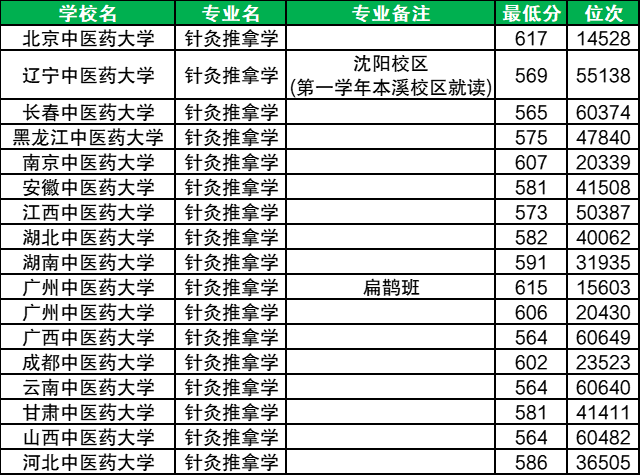 总的来看,各校针灸推拿学专业的分数比2024年上涨了约10分-50分左右不等,位次上升约1万名到6.5万名左右不等,整体同样呈暴涨趋势。