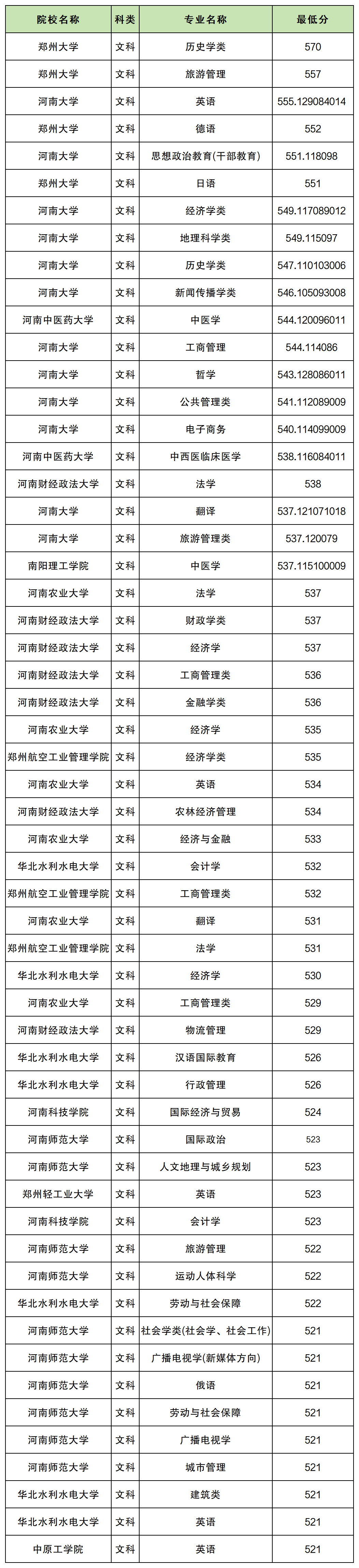郑州大学(旅游管理557分)、河南大学(英语555分)、郑州大学(德语552分)等。