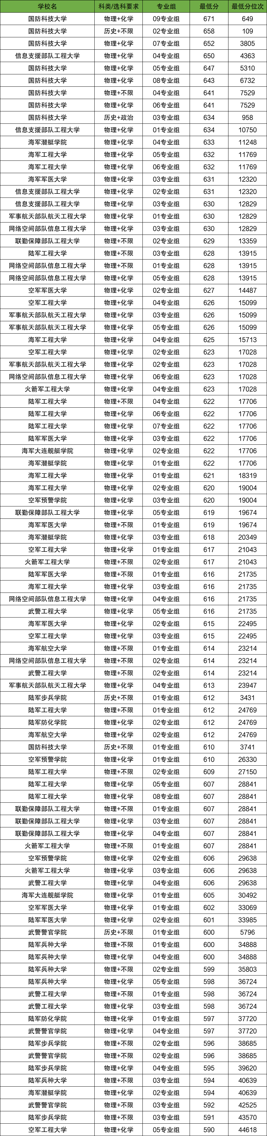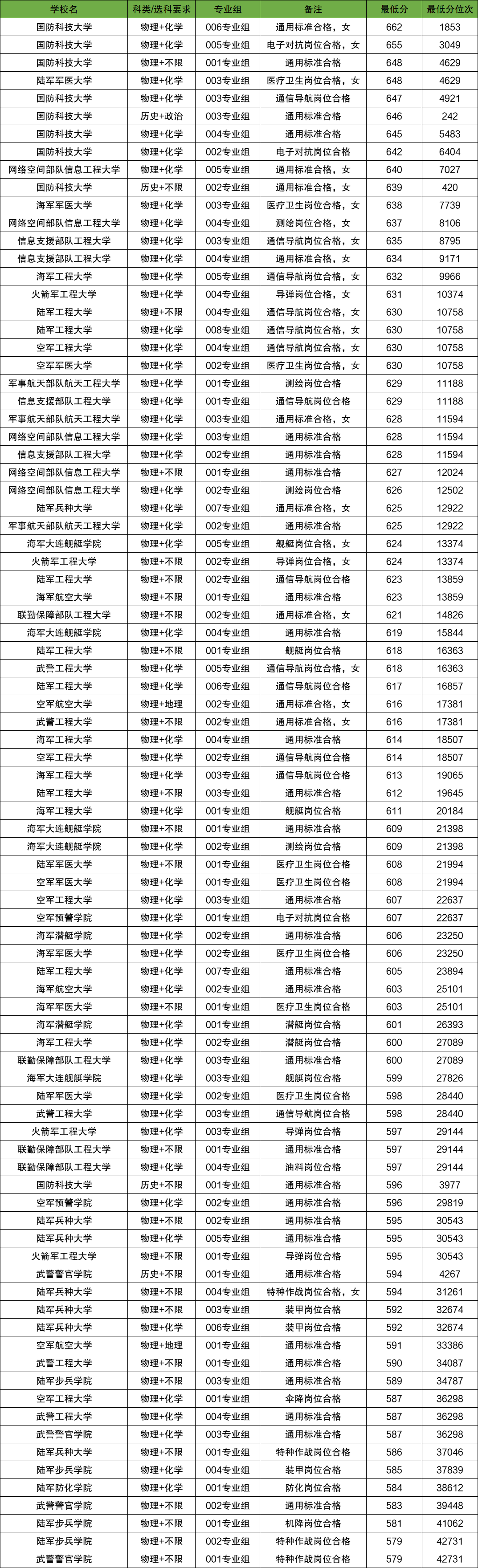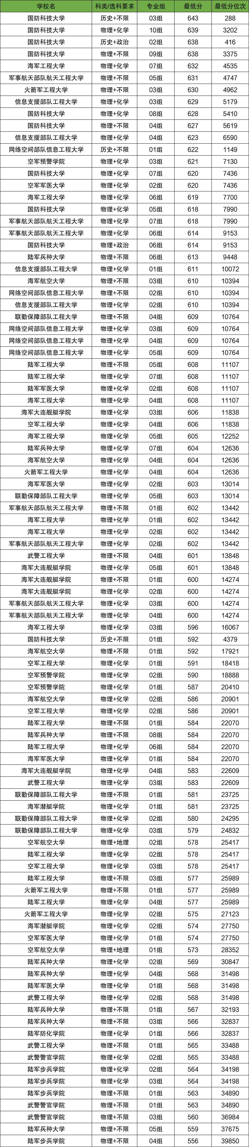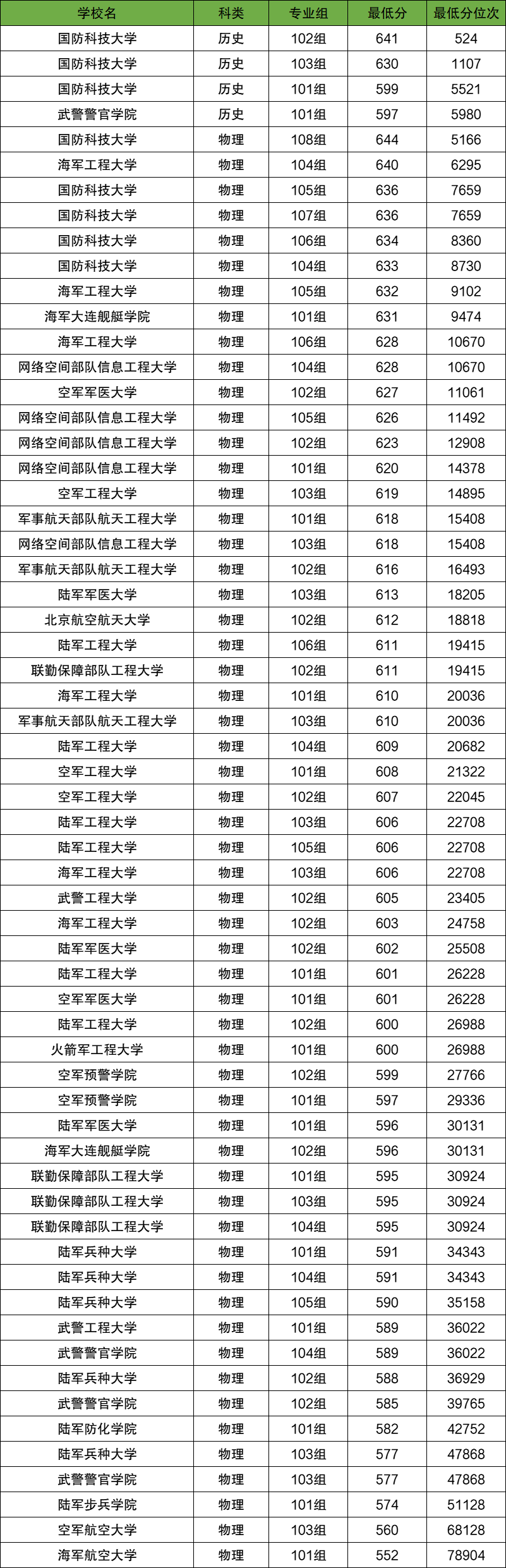 2025年一共有22所军校在江苏省招生,各军校最低录取分数线一览表如下: