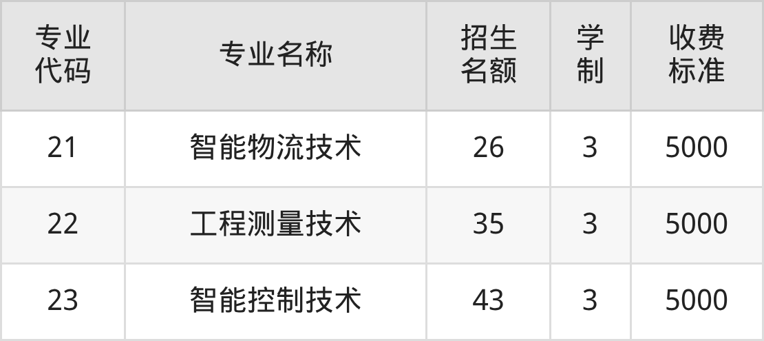 | 专业 代码 | 专业名称 | 招生 名额 | 学 制 | 收费 标准 |