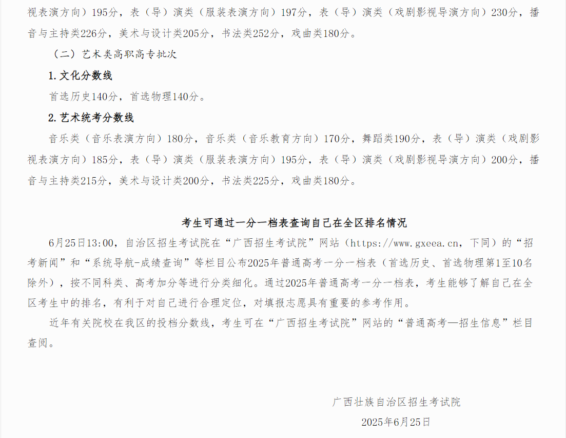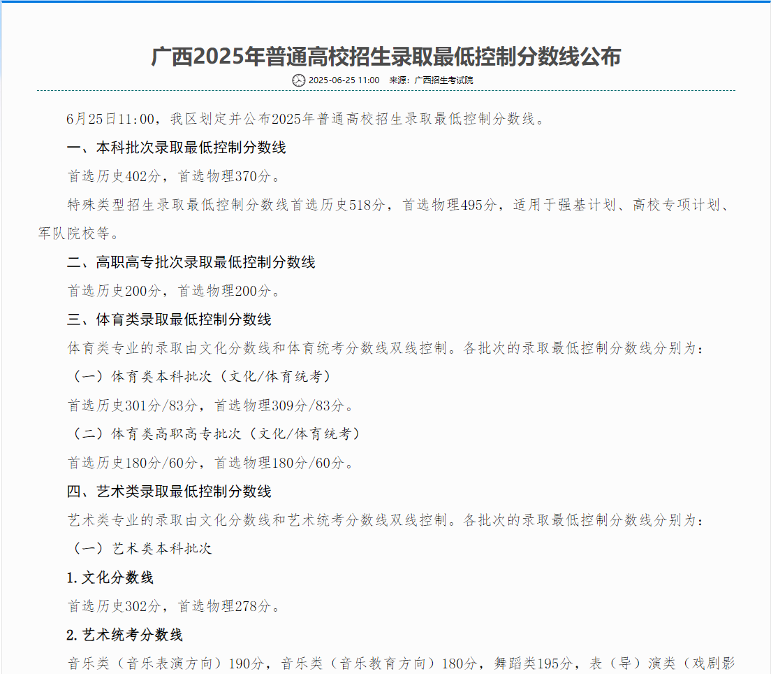 2025年广西高考分数线为:特控线为518分、本科批为402分、高职高专批为200分,此为历史类批次线。关于2025广西高考更多分数线及一分一段表详情,本文都进行了整理,供查阅。