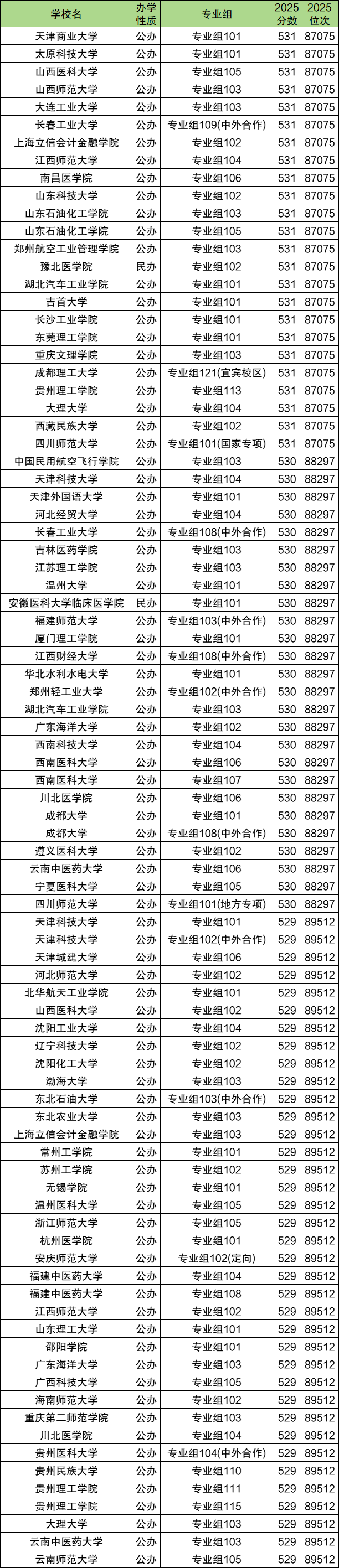 530分冲一冲的大学推荐:天津商业大学101组、山西师范大学103组、上海立信会计金融学院102组、山东科技大学102组等,2025年最低分531分。