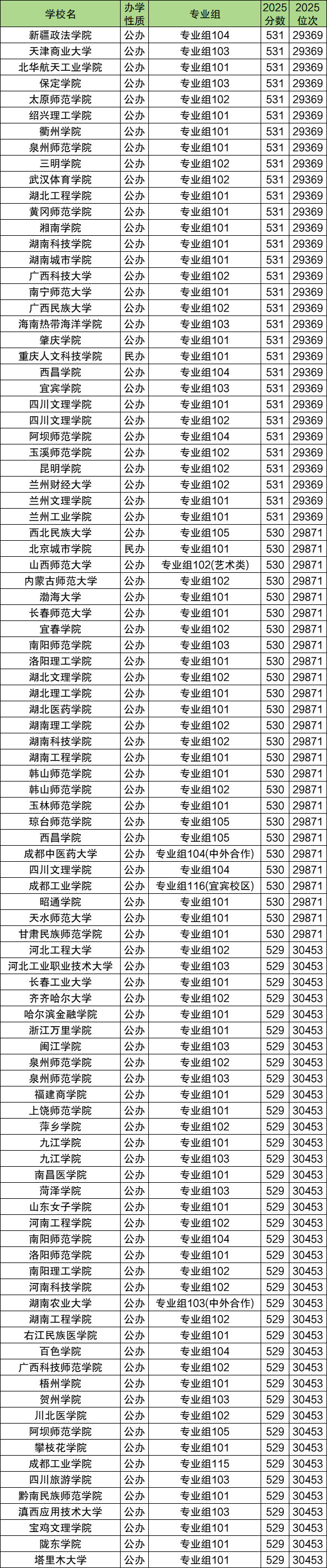 530分冲一冲的大学推荐:新疆政法学院104组、黄冈师范学院101组、广西科技大学102组、兰州财经大学102组等,2025年最低分531分。