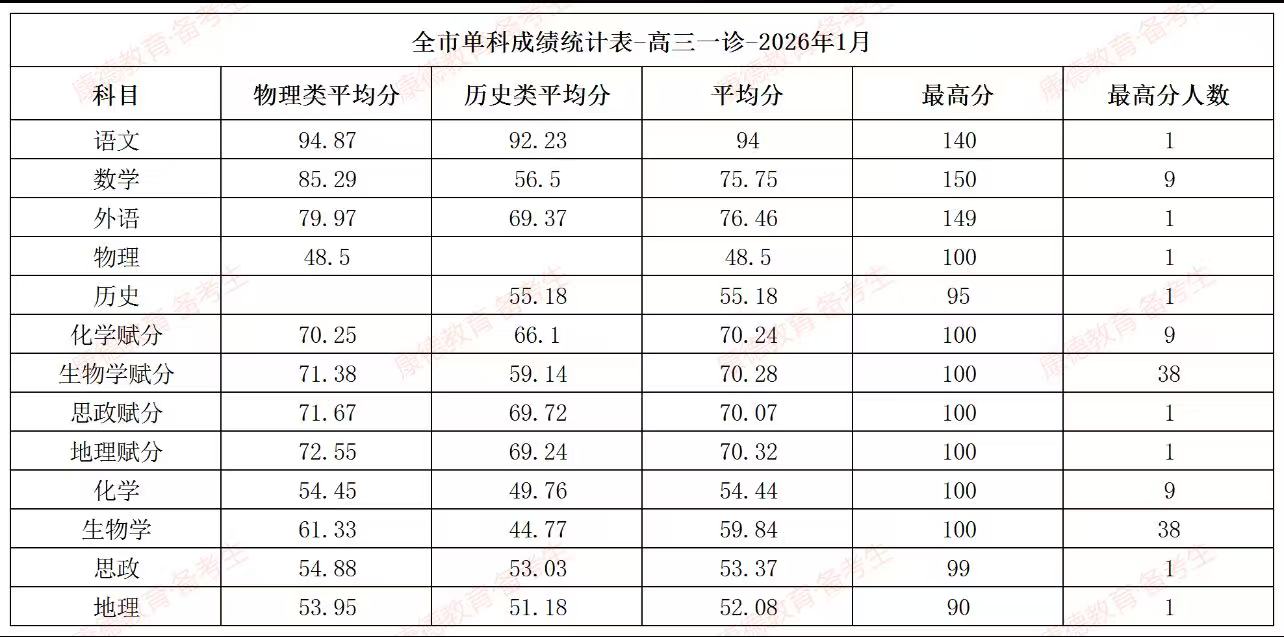 下面是2026重庆一诊康德卷全市单科成绩平均分及最高分: