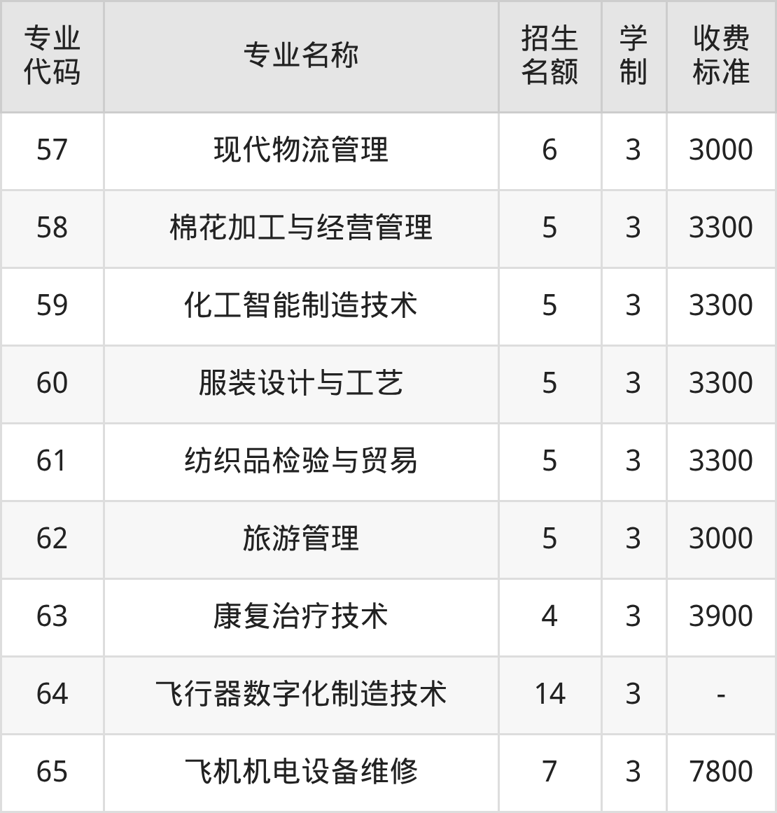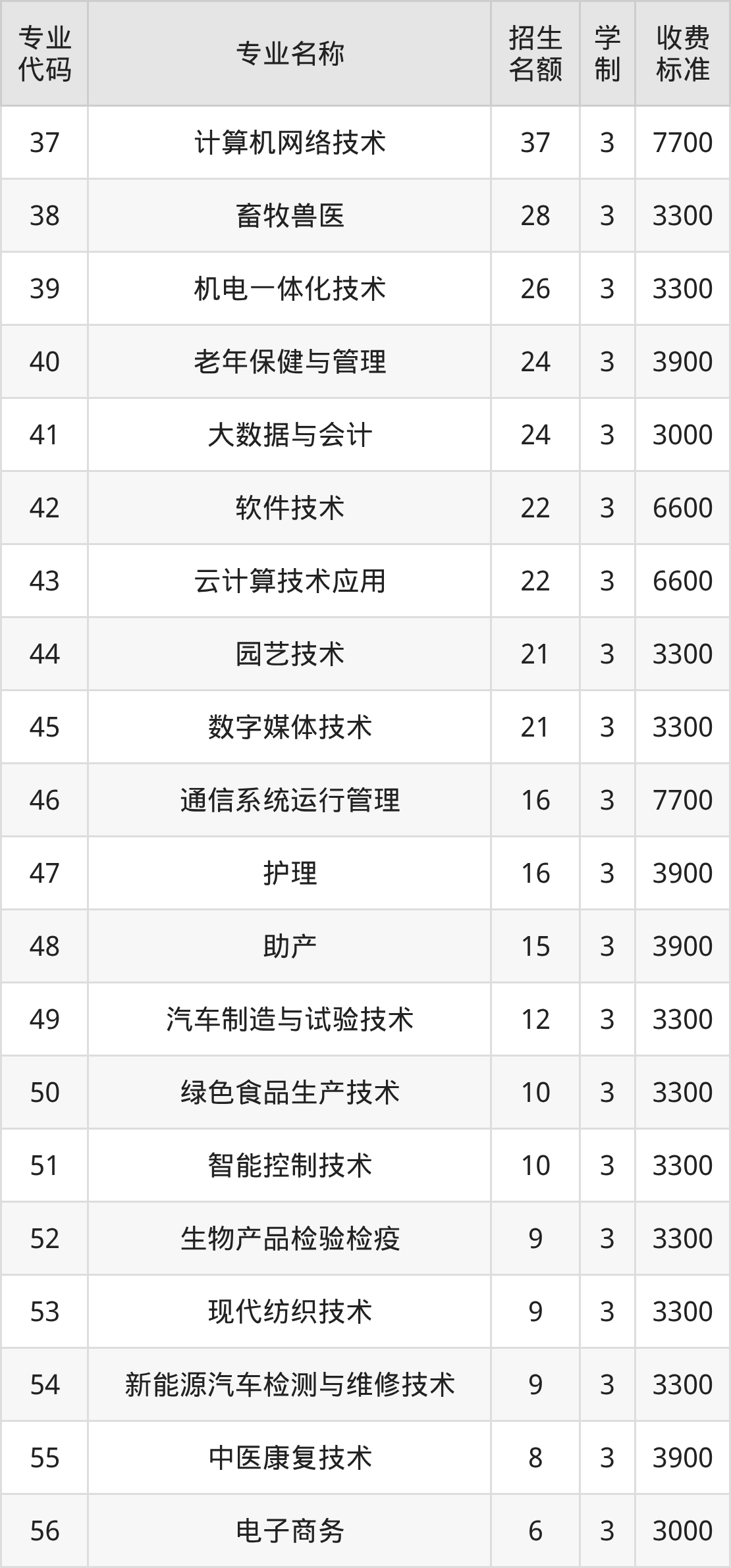 | 专业 代码 | 专业名称 | 招生 名额 | 学 制 | 收费 标准 |