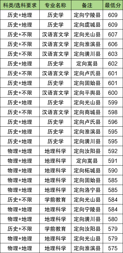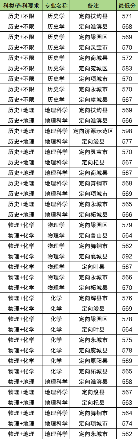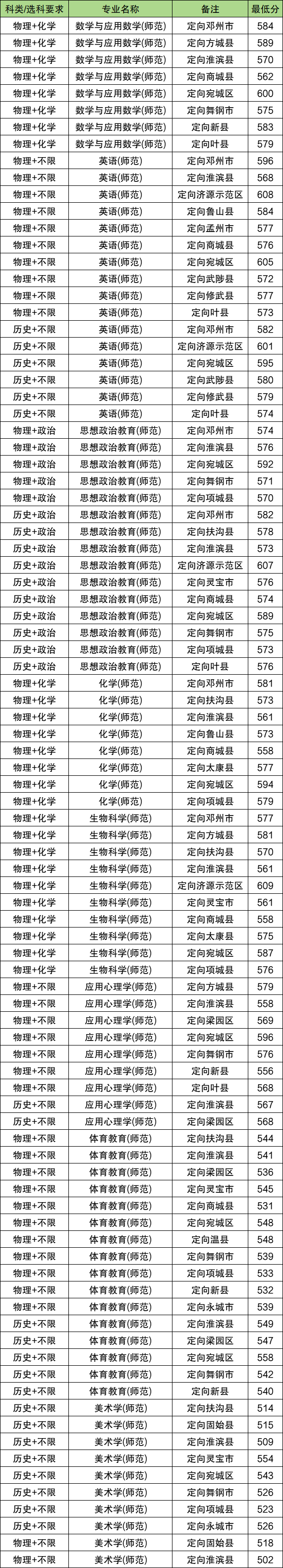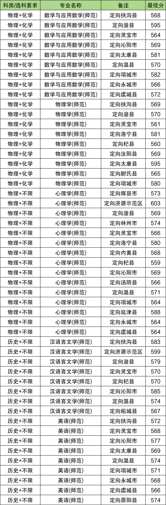 2025年河南大学为优师专项计划招生,各专业最低录取分数线及选科要求一览表如下:
