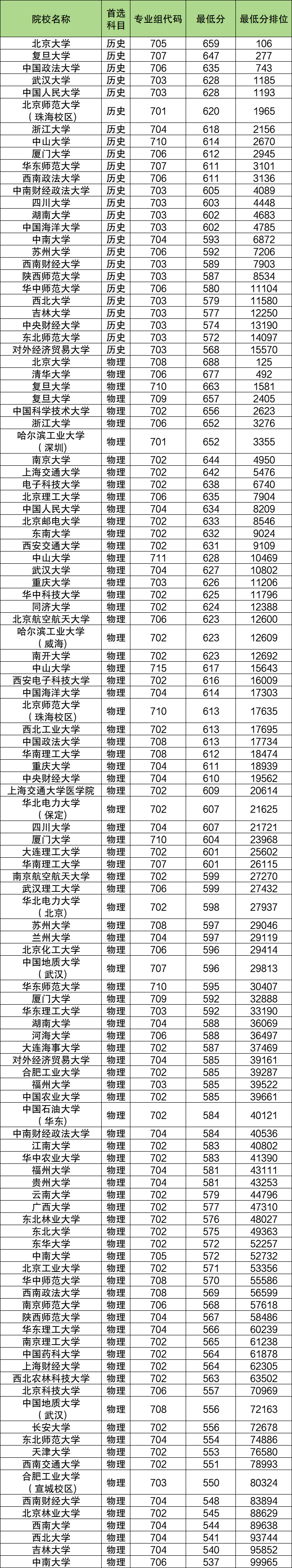 代表院校及分数:北京大学(专业组代码705)659分、复旦大学(专业组代码707)647分、中国政法大学(专业组代码706)635分、武汉大学(专业组代码703)628分、中国人民大学(专业组代码703)628分等。