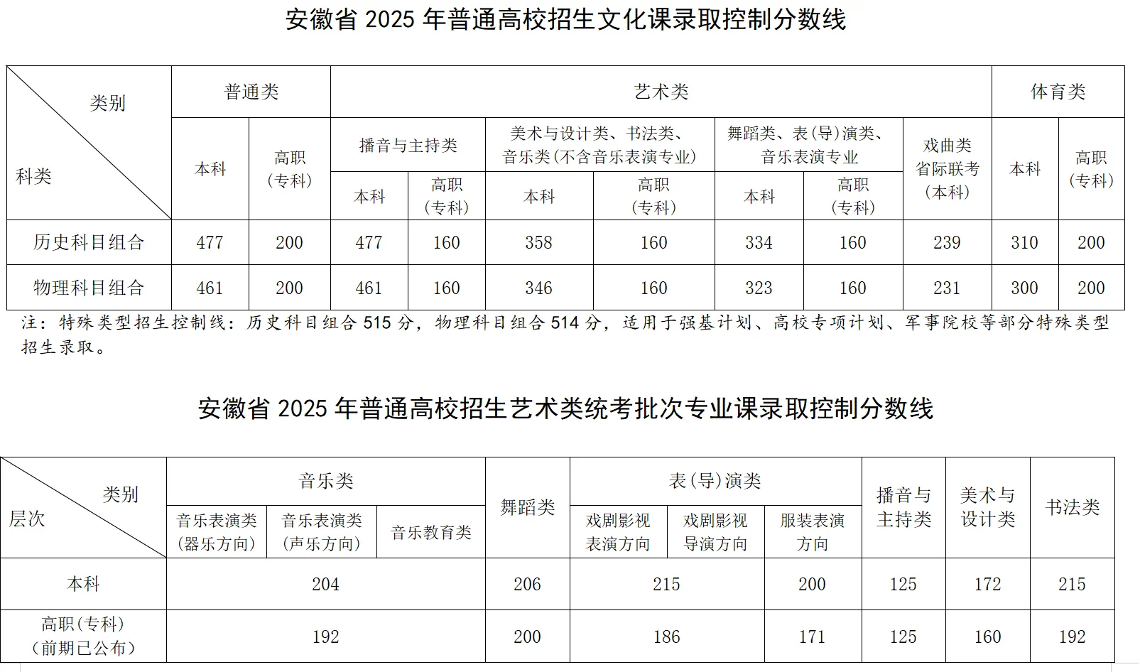 2025年安徽高考分数线为:特控线为515分、本科批为477分、高职(专科)为200分,此为历史类批次线。 关于2025安徽高考更多分数线及一分一段表详情,本文都进行了整理,供查阅。
