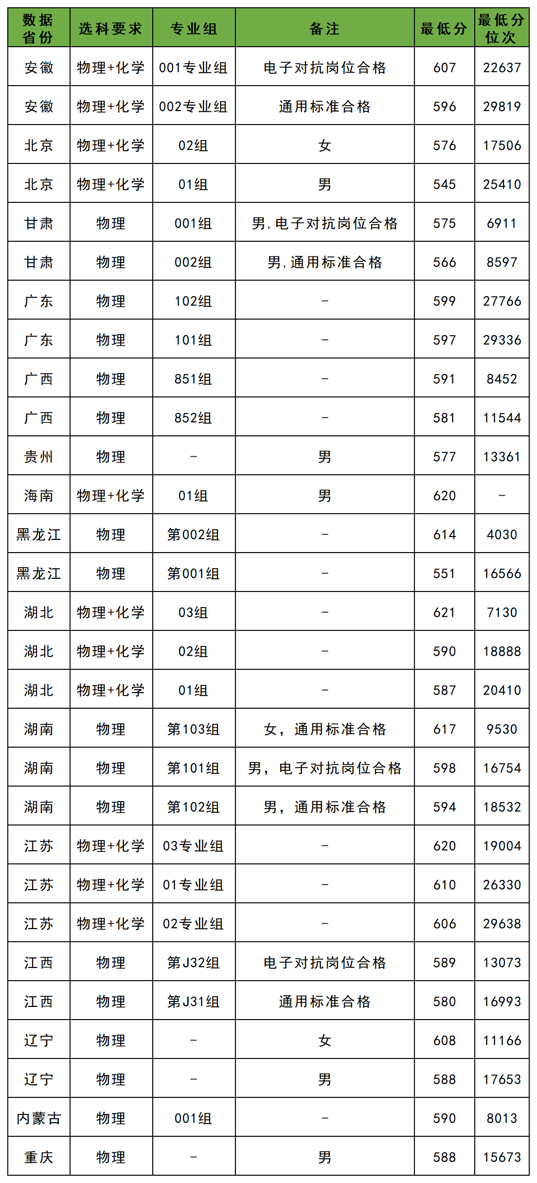 如2025年空军预警学院在甘肃省物理类招生最低分为566分。在贵州物理类招生最低分为577分。