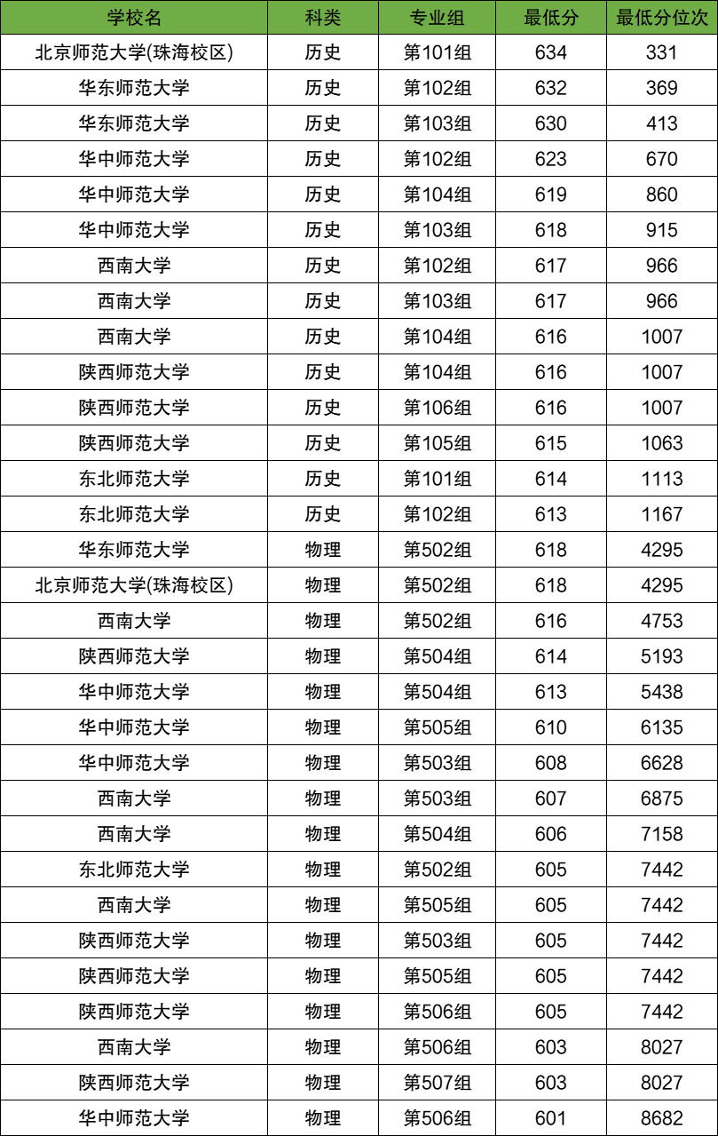 师范类提前批有北京师范大学、华东师范大学、东北师范大学等学校,2025年江西历史类录取分数线是:北京师范大学(北京校区)634分(第101组)、华东师范大学632分(第102组)、华中师范大学623分(第102组)等。